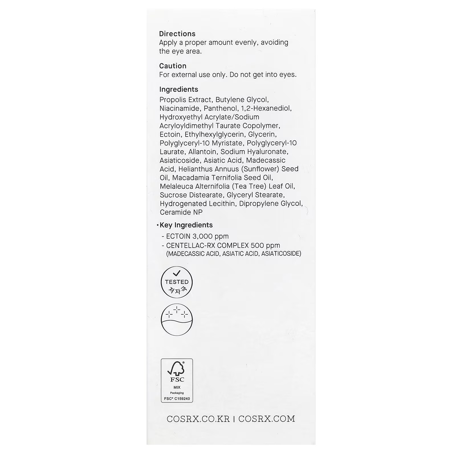 مستخلص البروبوليس، بوتيلين جليكول، نياسيناميد، بانثينول، 1.2-هيكسانيديول، هيدروكسي إيثيل أكريليت/أكريلولديميثيل توريت كوبوليمر، إكتوين، إيثيل هكسيل جليسرين، جليسرين، بولي جليسريل -10 لوريت، بولي جليسريل -10 ميريستات، ألانتوين، هيالورونات الصوديوم، آسياتيكوسايد، حمض آسياتيك، حمض الماديكاسيك، زيت بذور هيليانثوس أنوس (عباد الشمس)، زيت بذور المكاداميا تيرنيفوليا، زيت أوراق الميلاليوكا ألترنيفوليا (شجرة الشاي)، ديستيرات السكروز، ستيرات الجليسريل، الليسيثين المهدرج، ديبروبيلين جليكول، سيراميد NP