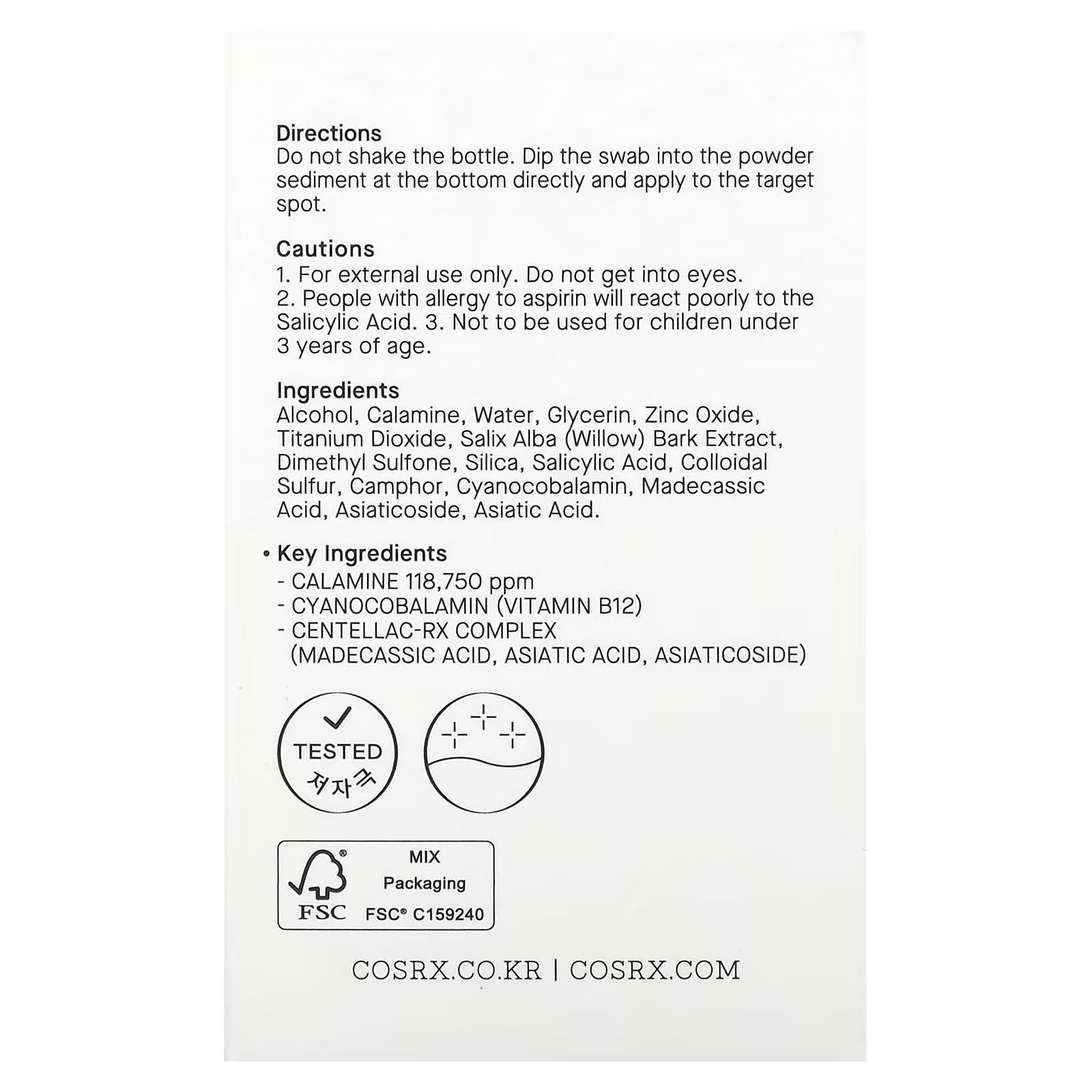 كحول، ماء، كالامين، جليسرين، ثاني أكسيد التيتانيوم، أكسيد الزنك، ثنائي ميثيل سلفون، سيليكا، بوتيلين جلايكول، حمض الساليسيليك، مستخلص لحاء ساليكس ألبا (الصفصاف)، كبريت غرواني، إيثيل هيكسانيديول، صمغ السنط السنغالي، 1، 2- الهيكسانيديول، الكافور ، سيانوكوبالامين، حمض الماديكاسيك، أسياتيكوسيد، حمض الآسيوي