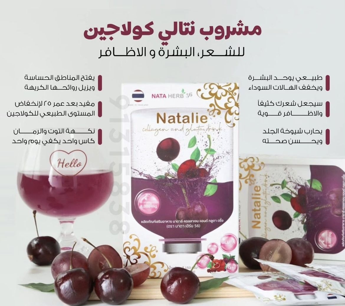 مشروب كولاجين نتالي Natalie collagen drink تحتوي العلبة الواحدة من الكولاجين على 15000 ملجم من كولاجين بيتا المستخرج من الأسماك، مما يساعد على استعادة الكولاجين في البشرة، ويزيد من الإنزيم المساعد Q10 وهو مضاد للأكسدة ومضاد للشيخوخة ويعمل على تفتيح لون البشرة وتخليصها من الترهل. كل علبة تحتوي على 10 اكياس.