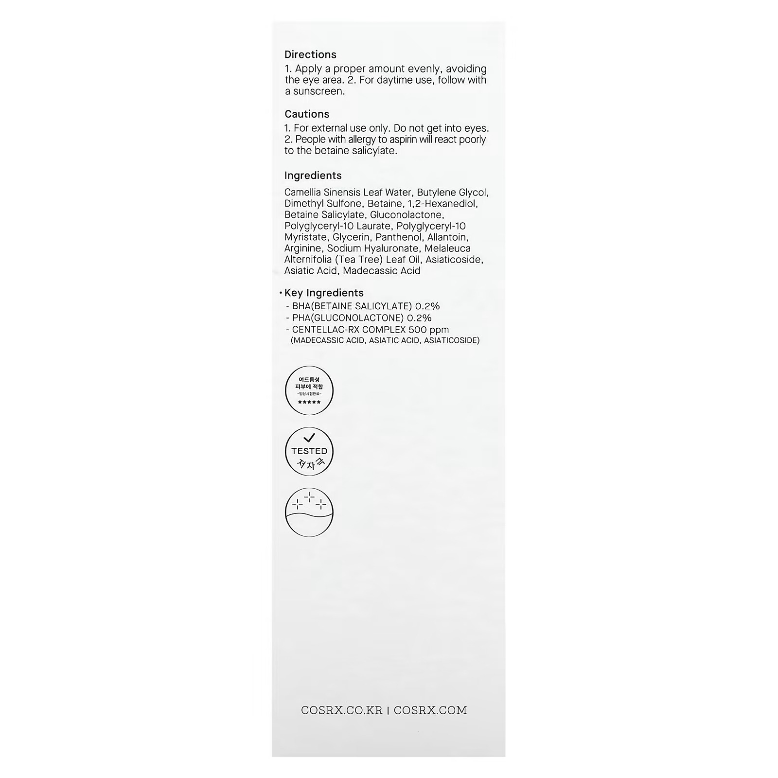 لا تعالج هذه التركيبة حب الشباب فحسب ، بل تساعد أيضًا على تنشيط البشرة واستعادتها دون أي تهيج من خلال مركب COSRX Centella AC-Rx. تشتمل التركيبة المهدئة على ثلاثة مكونات علاجية أسطورية – حمض ماديكاسيك ، أسياتيكوزيد ، وحمض آسياتيك. الذي بدوره يقضي على الحبوب الكيسية و آثار البقع والتصبغات من على البشرة