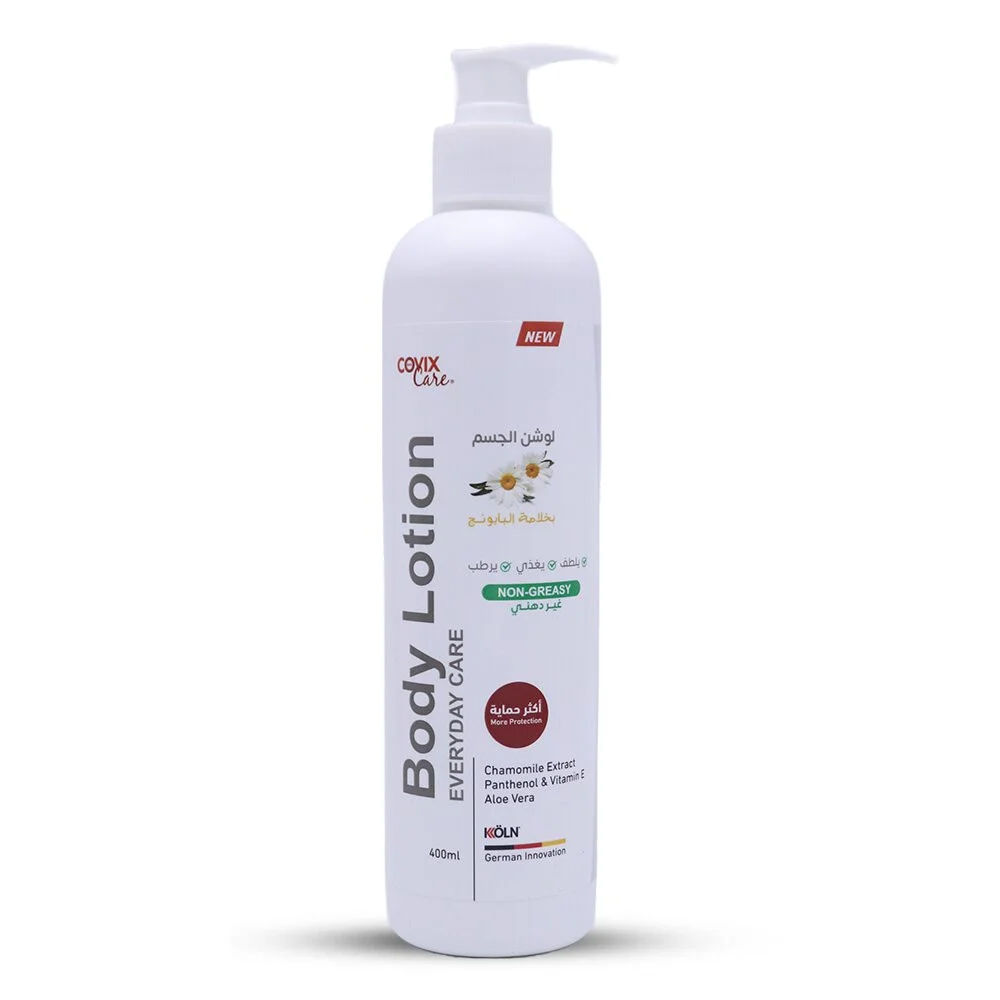 كوفيكس كير لوشن الجسم بخلاصة البابونج هو تركيبة مميزة خلاصة الصبار و خلاصة زهرة البابونج و مزيج من فيتامين ه و البانثينول تساعدك لتلطيف و ترطيب البشرة و تغذيتها بالفيتامينات الضرورية لتبدو بمظهر ورائحة و ملمس خلاب.