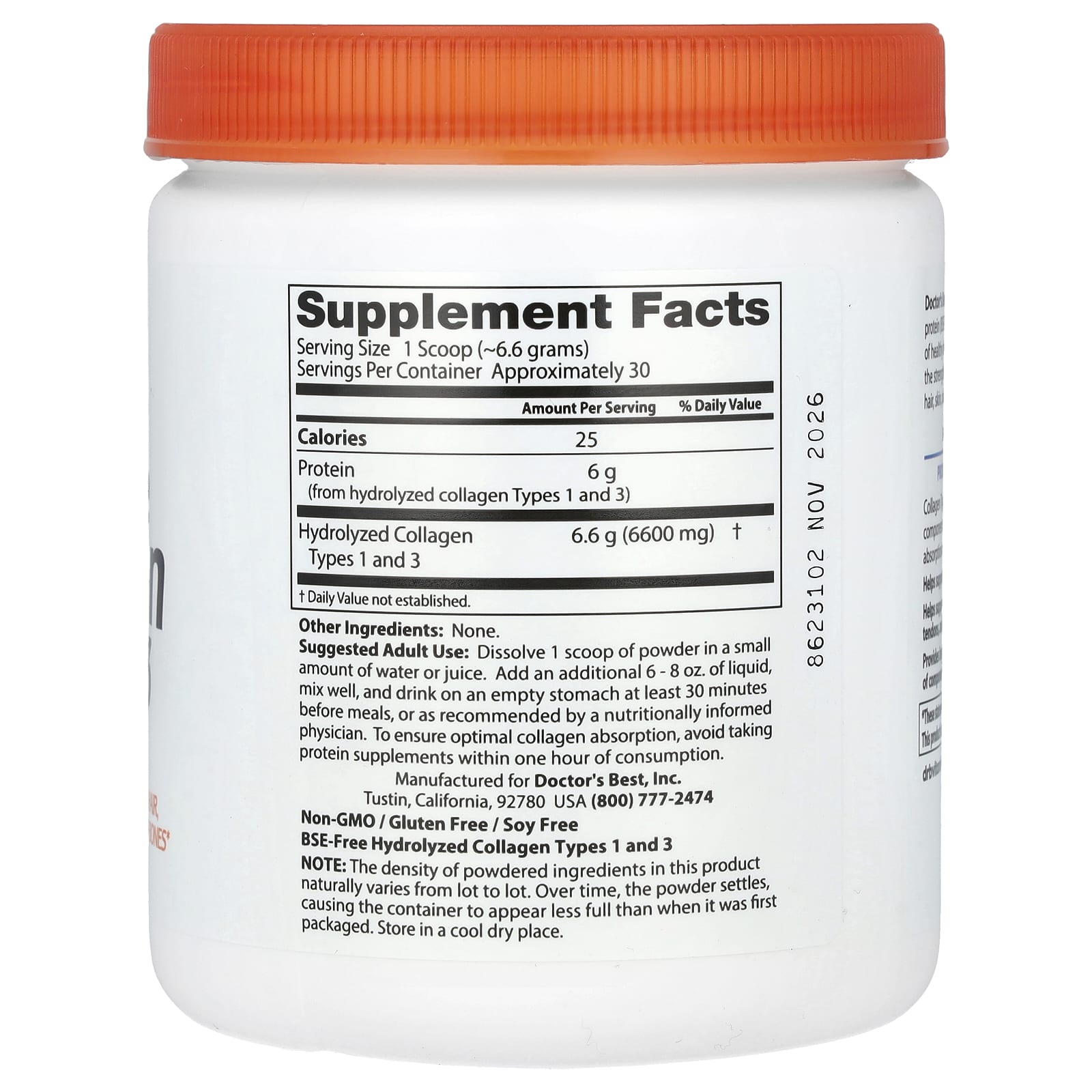 يحتوي الكولاجين النقي من النوعين 1 و3 من Doctor’s Best على بروتين الكولاجين النقي (خال من الاعتلال الدماغي الإسفنجي البقري)، والذي يساهم في النمو الصحي للأنسجة والحفاظ عليها. الكولاجين هو البروتين البنيوي الأساسي لقوة العظام ومرونة المفاصل والأوتار والأربطة والشعر والبشرة والأظافر والأنسجة الأخرى في جميع أنحاء الجسم.