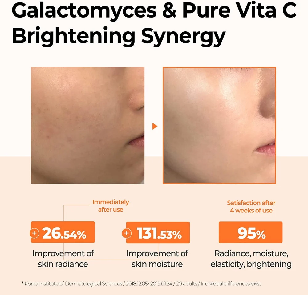 سيروم يومي يمنح البشرة إشراقة لا مثيل لها لاحتوائه على 75 %من الجلاكتوميسز و3 %من فيتامين سي النقي، له فعالية مزدوجة لتفتيح البشرة وعلاج التجاعيد. مضاد للأكسدة ويقلل من علامات التقدم بالسن لاحتوائه على مكونات عالية الفعالية مثل النياسيناميد ومستخلصات نباتية كورية و10 أنواع مختلفة من الفيتامينات