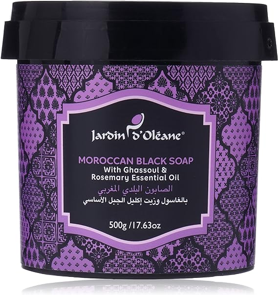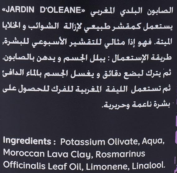 الصابون البلدي المغربي بالغاسول وزيت إكليل الجبل الأساسي هو صابون أسود مغربي من جاردن أوليان بتركيبة مقشرة طبيعية المصدر.