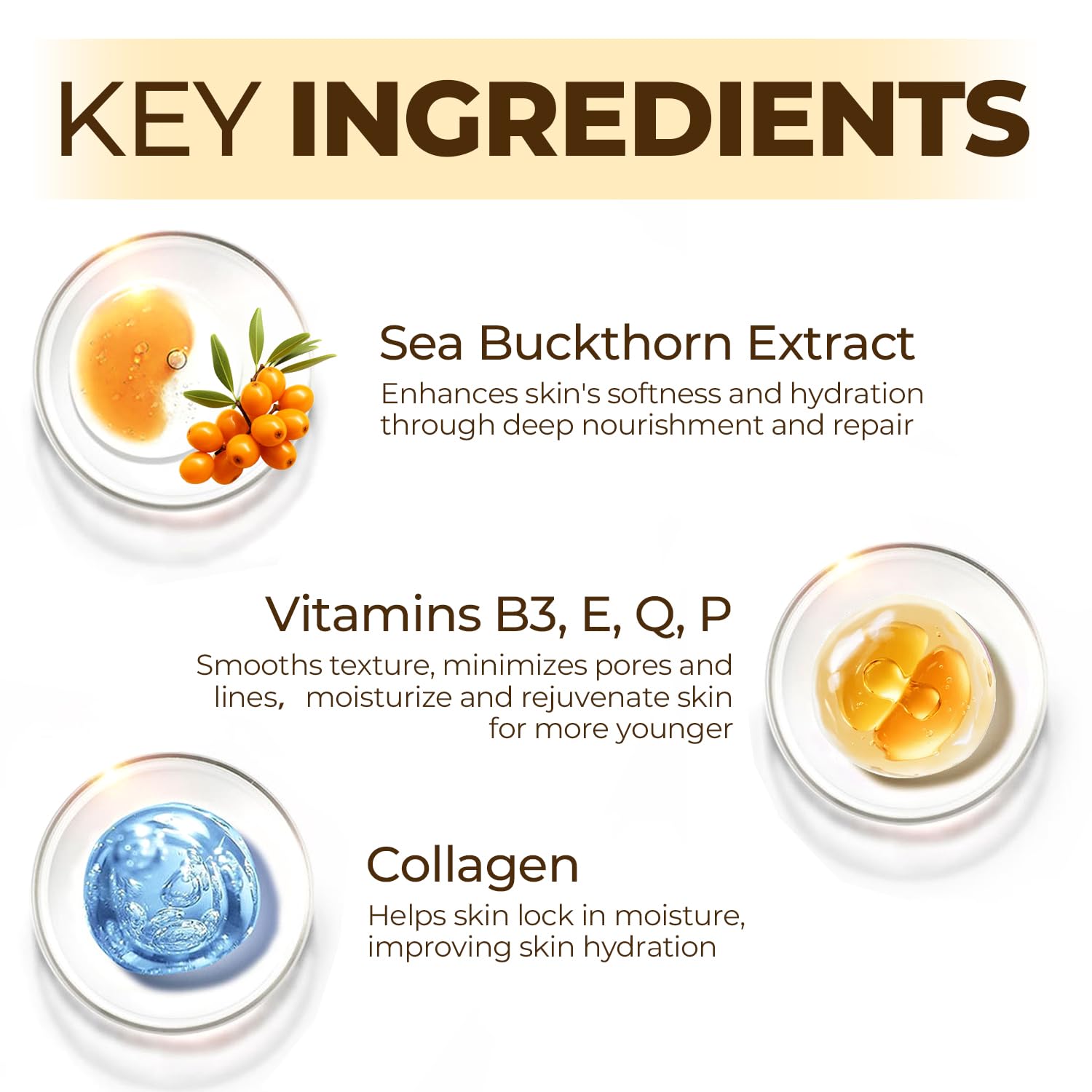 شدّ وتنعيم البشرة: يحتوي الكريم على كولاجين منخفض الوزن الجزيئي وفيتامين B، مما يساهم في تقليل الخطوط الدقيقة والتجاعيد وتعزيز إنتاج الكولاجين، ليجعل البشرة أكثر تماسكًا ونعومة.