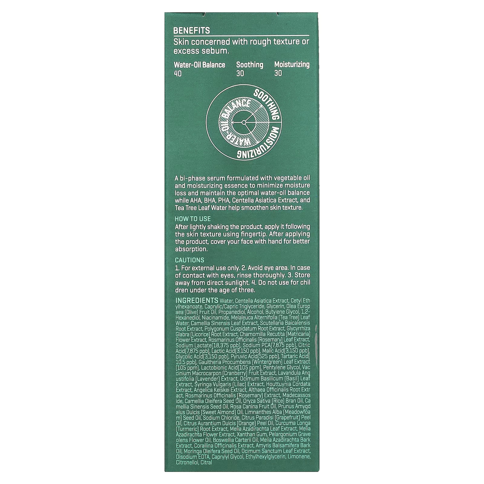 سيروم معالج ومهدئ للبشرة المعرضة لحب الشباب لاحتوائه على تركيز عالي من شجر الشاي الأخضر (10,000 جزء في المليون) ومستخلص نبات السينتيلا اسياتيكا (14.5%).